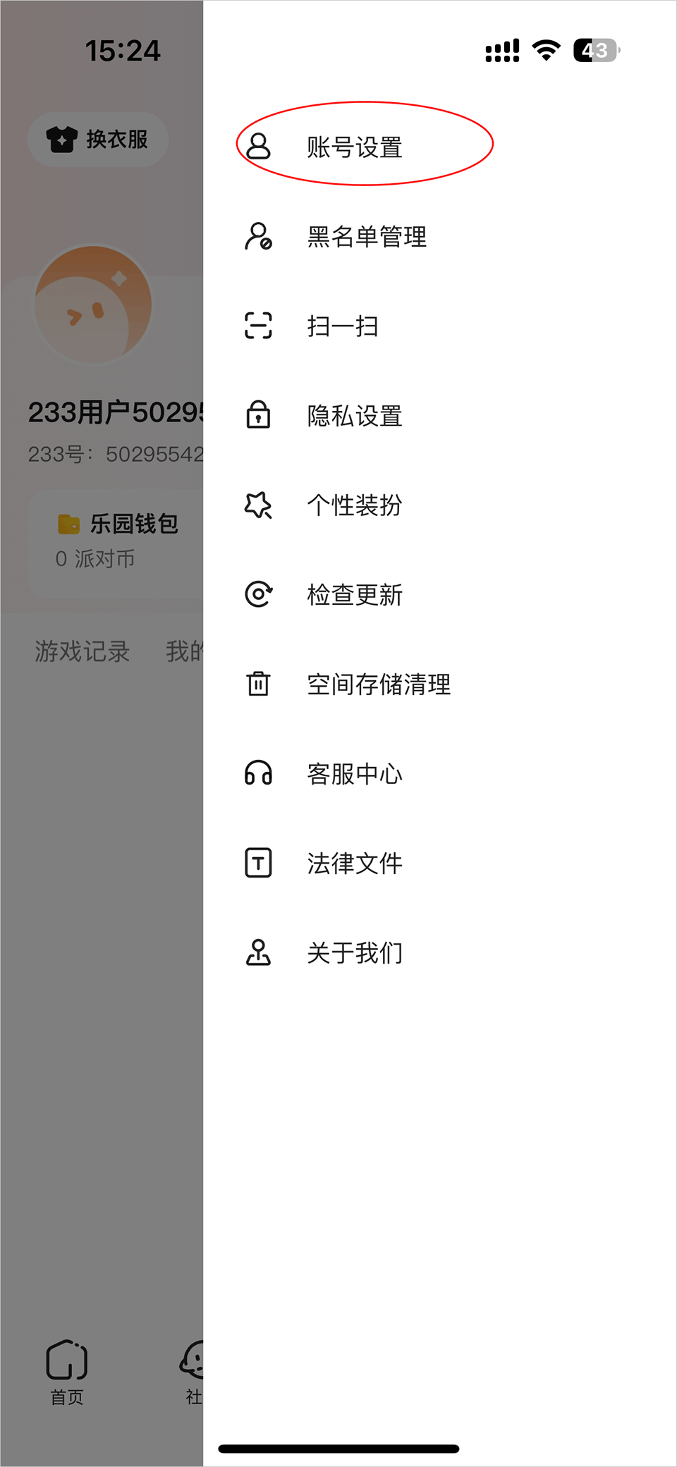 1、首先进入到233乐园当中,进入“我的”板块,点击“账号设置”;