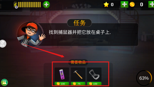 3、主界面显示当前任务进度为63%,要求找到捕鼠器并把它放在桌子上等待老师中招。