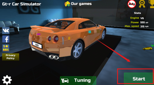 1、进入Gt-r Car Simulator主界面,车辆数据一目了然,555马力315极速显示清晰,点击Start开启驾驶之旅。