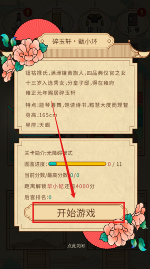3、选择碎玉轩甄小环等角色,了解背景特点,提升等级分数,解锁华小妃新角色。