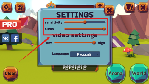 2、进入SETTINGS设置面板,sensitivity灵敏度与audio音频参数自由调节,Language语言支持Pycckun俄语切换。