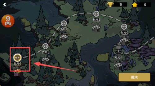 4、进入地图界面,选择标有 “危险 1” 的初始区域,点击 “继续” 进入对应的关卡。