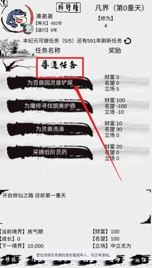 4、为灵兽铲屎寻找炉鼎等任务奖励丰厚,财富名望立场各有增减,591年后刷新新任务,策略选择影响深远。