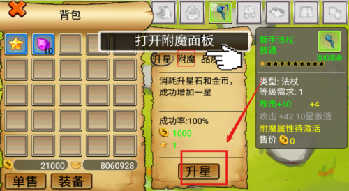 4、背包打开附魔面板,新手法杖升星消耗资源,攻击+42属性显著提升,装备系统深度足够研究。