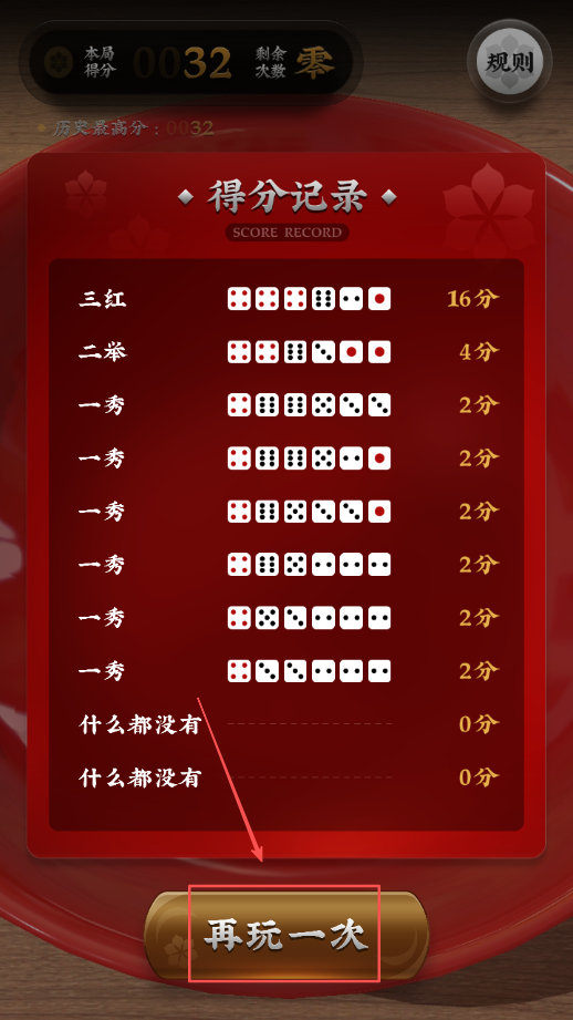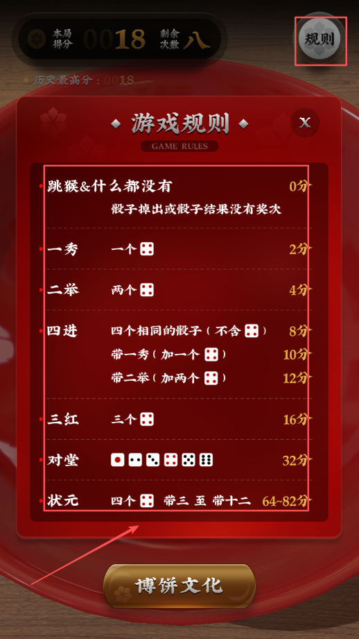 4、点击右上角查看详细规则说明与历史记录,学习更多博饼技巧和特殊组合的判定标准与奖励机制。