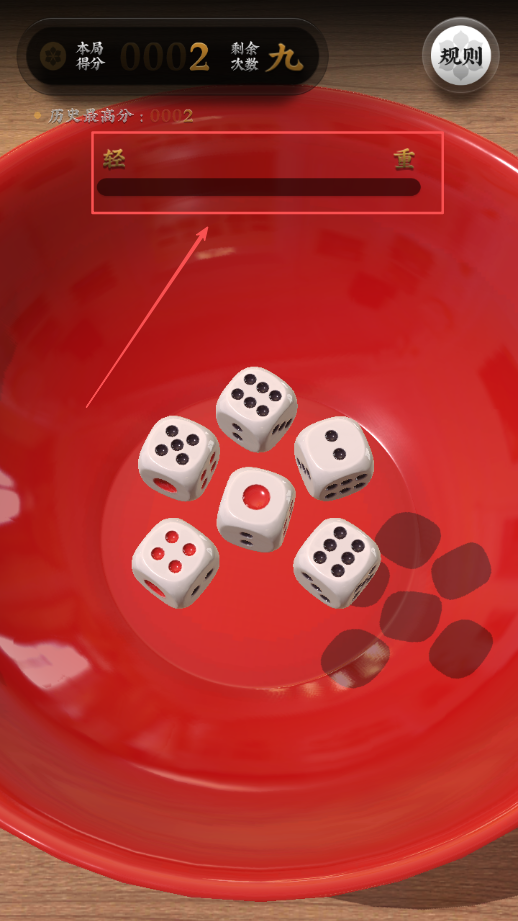 2、通过长按屏幕控制投掷力度大小和方向角度,松开手指即可掷出骰子开始博饼过程并观察结果。