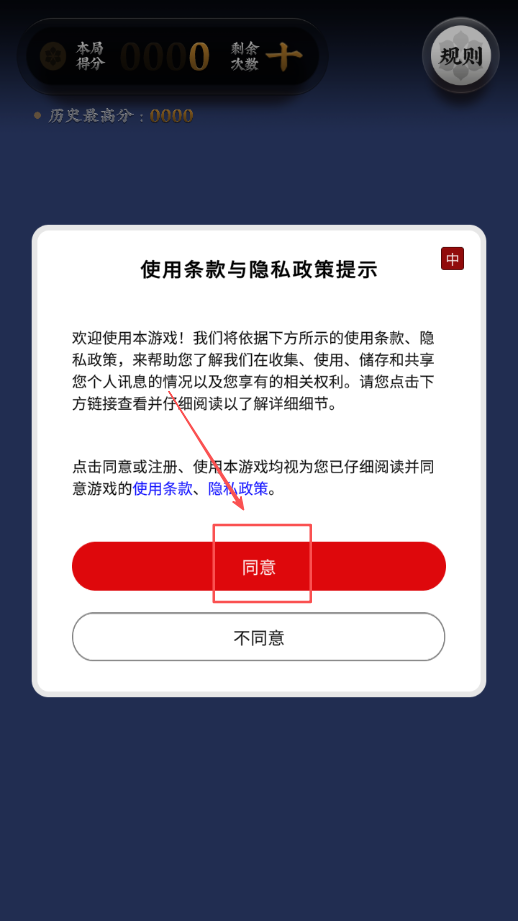 1、首先点击同意按钮正式进入游戏主界面开始你的博饼体验之旅,熟悉基本操作界面布局和功能区域分布。