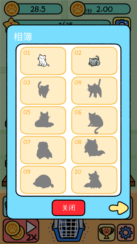 萌宠派对是一款以猫咪为主题的休闲放置手游,游戏中,玩家需要通过点击操作,开启箱子,获取不同种类的猫咪。游戏涵盖了丰富多样的猫咪品种,玩家可以使用金币,升级箱子的等级,加速获取箱子的时间,而且每获得一种猫咪,玩家都能点亮一个图鉴。同时玩家离线的时候,猫咪也会一直生产金币。想拥有可爱的小猫咪吗?那就快来下载萌宠派对吧!